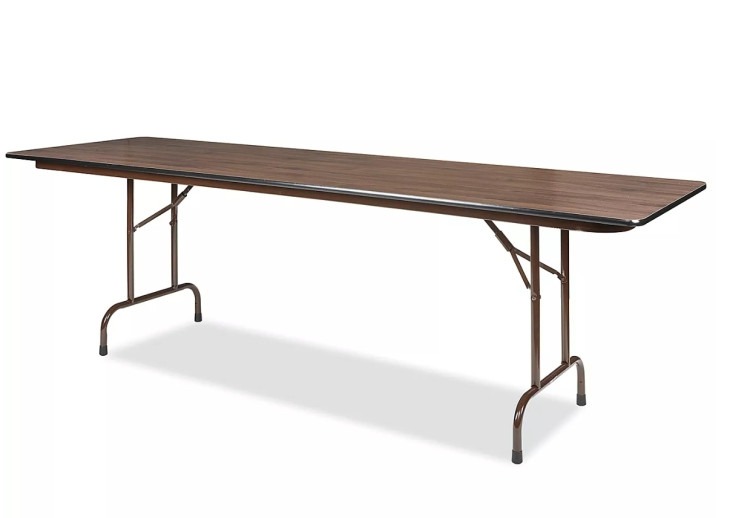 Classic 8-foot wooden rectangular tables built for events. Solid wood top with folding legs gives a sturdy, stable surface for dining, buffets, or displays. Seats 8 to 10 people. Suitable for indoor use or covered outdoor setups; heavy-duty build for a steady, reliable setup.